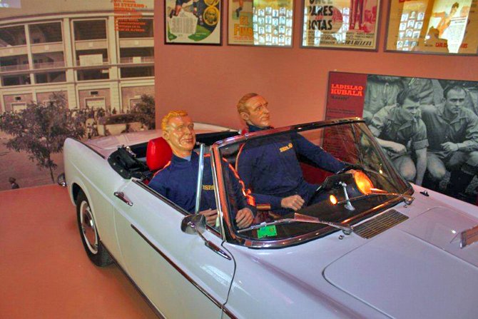 Легендарный автомобиль великого форварда. Когда-то этот Fiat 1500 Cabrio принадлежал Ди Стефано. За рулем, собственно, это он и есть. А на пассажирском месте — друг Кубала. Машина, кстати, абсолютно исправная. Последний техосмотр пройден в 2007 году.