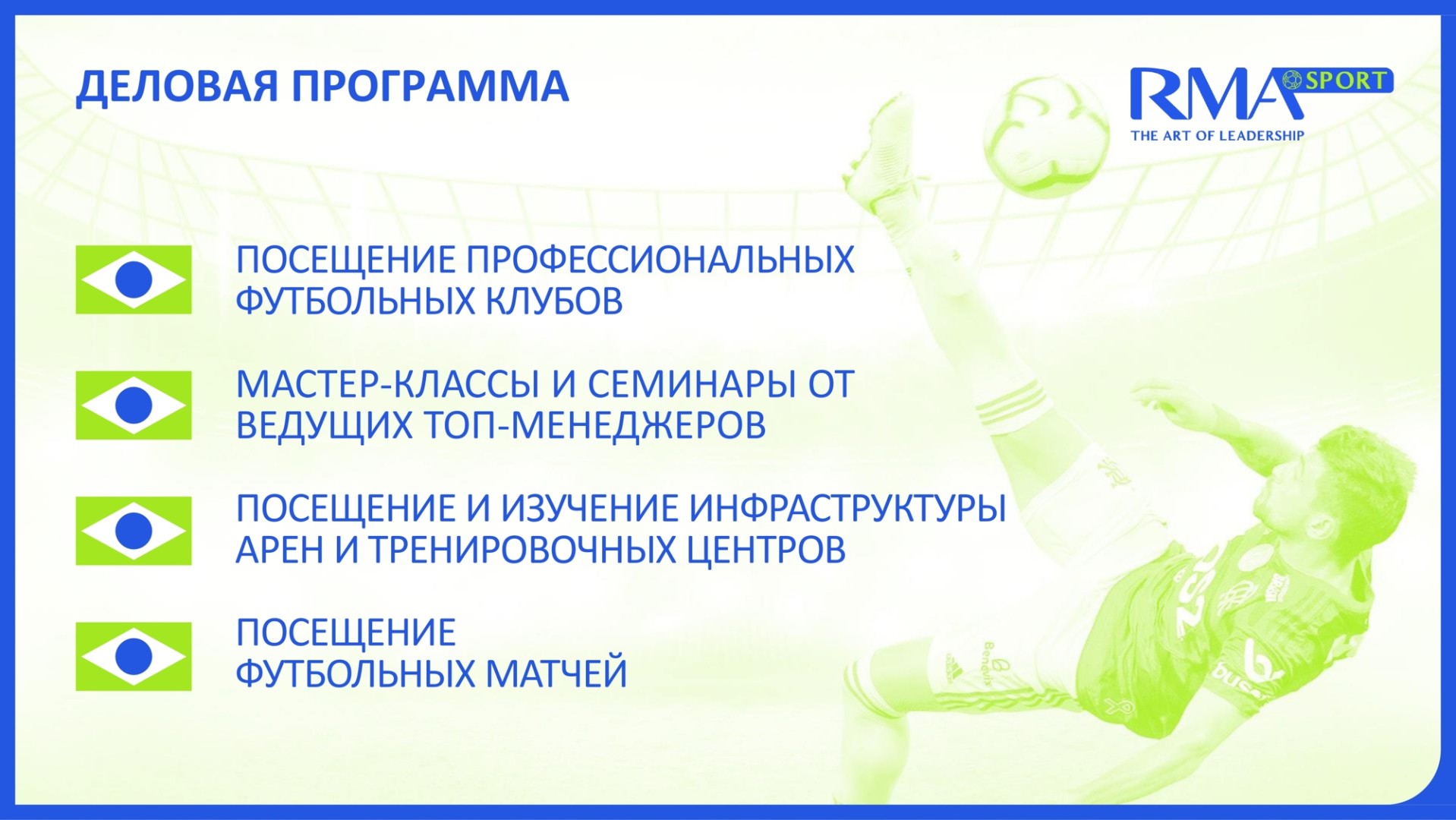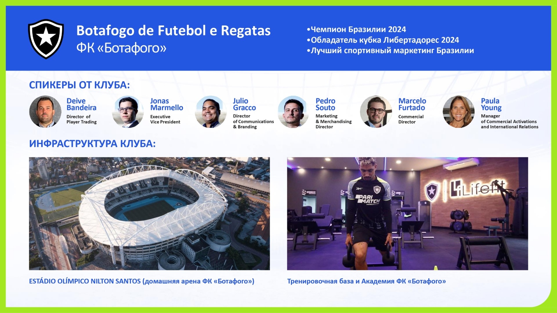 — встречи и мастер-классы с топ-менеджерами клубов: Botafogo FC, Palmeiras, São Paulo FC, Vasco da Gama;