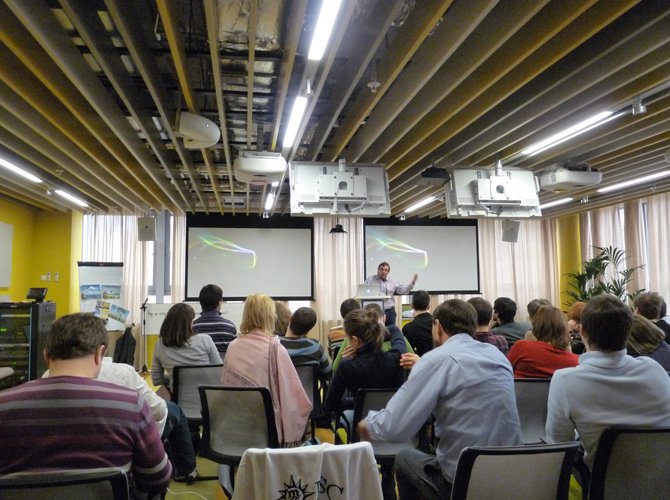 В минувшую субботу у группы «И-10» программы бизнес-образования «Менеджмент в сфере интернет-технологий» RMA состоялось выездное занятие в офис компании Google Russia. Там они получили уникальную возможность осмотреть рабочие пространства российского офиса крупнейшей мировой IT компании, доступ в которые редко открыт для гостей. После прогулки и неформальной беседы с топ-менеджрами компании Владимиром Долговым (генеральный директор Google Russia) и Алексеем Амилющенко (SoftLanding Project Manager), Владимир рассказал слушателям RMA о новые тенденциях в интернет-бизнесе, поделившись прогнозами индустрии на 10 лет вперед.