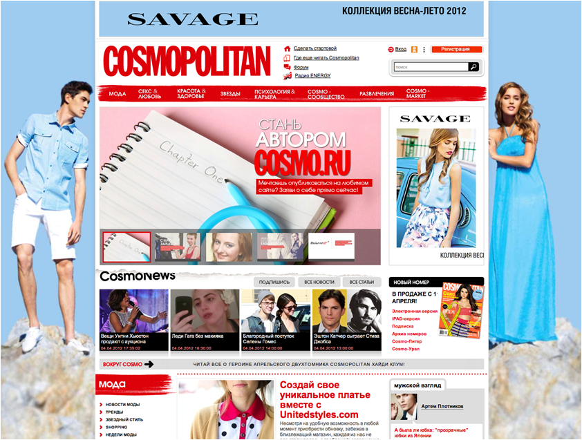 Пример, правильной рекламной политики сайта Cosmopolitan, когда под одного клиента — Savage — заняты все доступные рекламные места страницы: