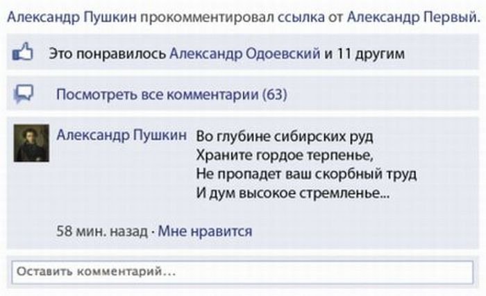 В частности, писатель Лев Толстой пытается опубликовать в Twitter запись длиною в несколько миллионов знаков. Свое сообщение он начинает со слов: «140 символов - это в высшей степени расстраивающее и вместе с тем оскорбляющее меня ограничение». Также в видеозаписи показано, как художник Василий Кандинский критикует «Черный квадрат» Казимира Малевича, опубликованный в фотохостинге Flickr, а Александр Пушкин получает бэйдж «Король балов» за частые чекины (отметки) на балах в неназванном геолокационном сервисе (очевидно, речь идет о Foursquare).