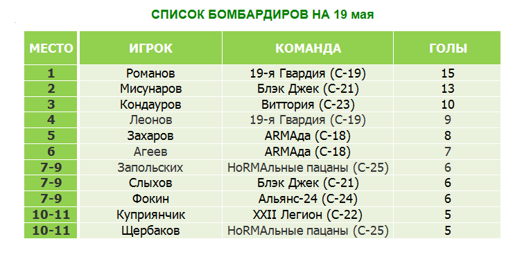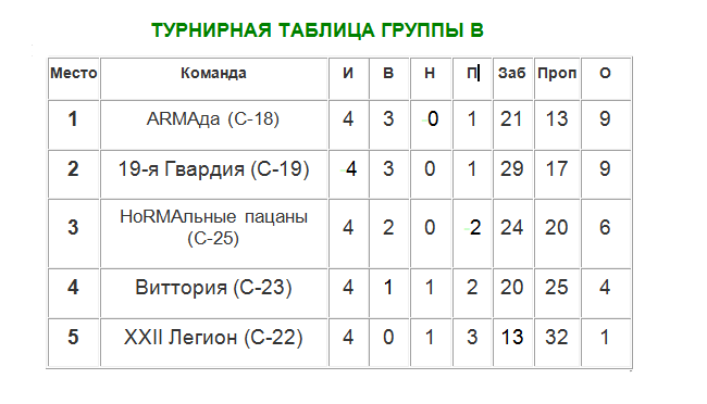 19 мая двумя перенесенными матчами финишировала групповая стадия III-го чемпионата RMA по мини-футболу. «XXII Легион» в упорной борьбе уступил «ARMAде» - 2:3. «19-я Гвардия» сломила сопротивление «Виттории» - 7:4. Намеченная на 21 апреля встреча между «ФК 0:8» и «ФиRMA» не состоялась в виду неявки на матч футболистов команды «ФиRMA», которой было засчитано техническое поражение со счетом 0:5. После четырех отборочных туров ситуация в турнирной таблице выглядит следующим образом.