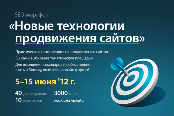 С 5 по 15 июня учебный центр «ТопЭксперт.РФ» проводит всероссийский 8-дневный SEO-марафон. Главной чертой мероприятия «Новые технологии продвижения сайтов» стал структурныйподход к процессу подачи материала. Это практические курсы, где новички учатся у профессионалов, профессионалы у экспертов. Кроме этого, в рамках SEOмарафона планируется ежедневные круглые столы, попасть на которые можно только по специальным приглашениям (онлайн-трансляция конференции будет доступна для всех желающих).Компания RMA приглашает слушателей и выпускников программы «Менеджмент в сфере интернет-технологий» посетить данное событие.