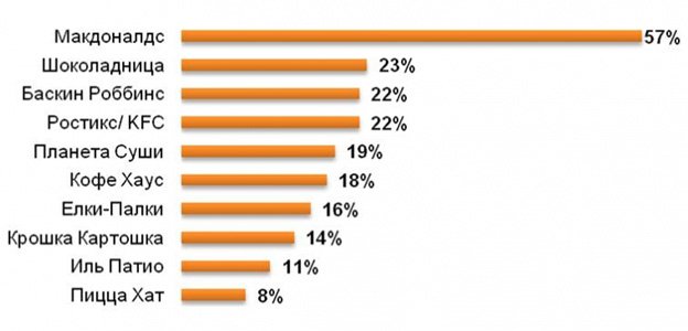 В пятерку наиболее посещаемых заведений вошли: МсDonald’s (с большим отрывом), «Шоколадница», «Баскин Роббинс», «Ростикс/KFC» и «Планета Суши».