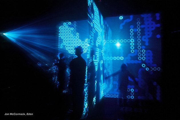 В выставке примут участие более десятка художников со всего мира. Среди них – австралиец Джон Маккормак с его инсталляцией «Эдем» (на фото), где автор выращивает цивилизацию виртуальных существ и которая представляет собой пример саморазвивающейся интерактивной системы. Американский художник Райан Вулф вживляет внутрь растений искусственные источники света — светодиоды, которые в течение дня меняют яркость, имитируя суточное прохождение солнца. Идея работы заключается в том, что технология сможет не только защитить жизнь, но и стать ее врожденным элементом, породив новую форму существования.