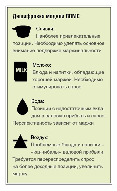 Как мы видим, картина получилась несколько иной. Ключевыми параметрами в этой модели являются валовой спрос и валовая маржа, а дополнительным фактором – значение маржи каждого блюда. Значение положения блюд в различных квадрантах показано на схеме «Дешифровка модели BBMC».
