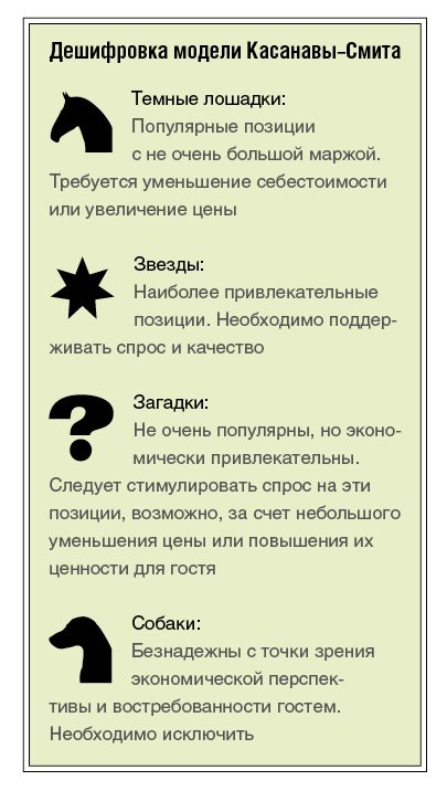 В результате построения модели (рис. 2) блюда распределились у нас по различным квадран-там, характеризующим их перспективность или бесперспективность с точки зрения наличия в ас-сортименте ресторана. Таким образом, в зависимости от попадания блюд в ту или иную часть диаграммы мы можем принять определенные решения относительно дальнейшей судьбы блюд, следуя логике, показанной на схеме «Дешифровка модели Касанавы–Смита».