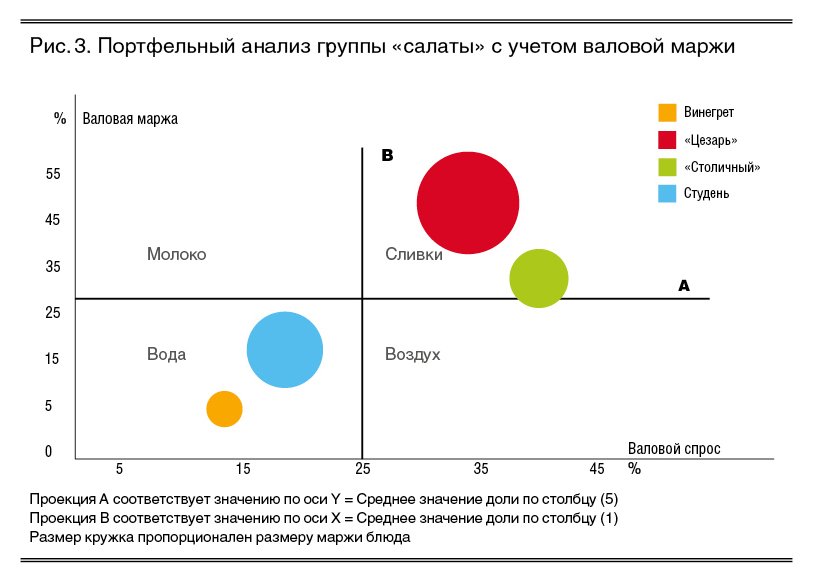К преимуществам метода меню-инжиниринга можно отнести тот факт, что он демонстрирует ресторатору наглядную картину с положением дел в ассортименте его ресторана с точки зрения эффективности продаж, учитывает фактор популярности, востребованности блюд гостями и одновременно маржинальную выгоду от реализации каждого блюда. Однако из нашего поля зрения выпадает важный аспект, связанный с оценкой удельной валовой маржи, которую дает блюдо. Между тем именно валовой эффект в денежном выражении является для предприятия главным мерилом экономического успеха. В связи с этим более правильным будет анализировать структуру продаж в трех измерениях, учитывая фактор спроса, индивидуальной маржи и валового маржинального эффекта в стоимостном выражении. В нашей интерпретации портфельный анализ будет выглядеть так, как показано на рис. 3.