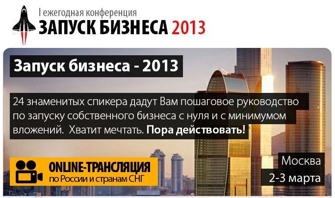 По статистике, 40% россиян задумываются о создании собственного бизнеса, но воплощают мечту в реальность всего 4%! Почему? Большинство не знает, как открыть свое дело, какую выбрать нишу и с чего именно стоит начать бизнес. А некоторые просто боятся расстаться с работодателем и начать работать «на себя». Организованная агентством специальных проектов PrimeTimeProduction конференция для начинающих предпринимателей «Запуск бизнеса – 2013», которая пройдет в Москве в марте 2013 года, расставит все точки над «i». «Запуск бизнеса» станет самым масштабным мероприятием, посвященным созданию собственного бизнеса. Для слушателей и выпускников всех факультетов бизнес-школы RMA предоставляется скидка 90%. Чтобы воспользоваться предложением, необходимо обратиться к Дарье Воробьевой по электронному адресу daria@rma.ru или телефону 8 495 786-8895.