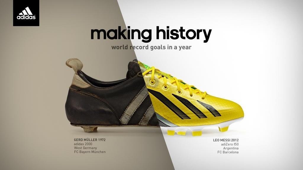 Немецкий концерн отметил, что Месси, как и Мюллер, играет в бутсах Adidas. Компания представила рекламный плакат, на котором изображена бутса, составленная из двух частей. Задняя половина представляет собой часть бутс Adidas 2000, которые носил Мюллер. Передняя половина - это часть бутс Adidas Adizero f50. Именно этой моделью с начала ноября 2012 года пользуется Месси.