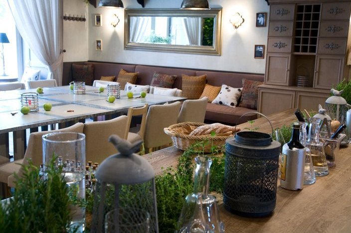По поводу другого какого–то дизайна мне даже говорить сложно. Каких-то ходов особенных мы не использовали. Понятно, что раз ресторан домашний, семейный, значит, это скорее классика – много дерева, много разных деревянных деталей, и так далее… И еще у нас была идея: чтобы заведение имело такой вид, как будто оно на этом месте лет пятьдесят уже находится, а еще лучше – сто пятьдесят. Ну, и мы положили дощатые полы, поставили мебель – столы, стулья – в прованском стиле, и они по прошествии двух лет приобрели как раз нужный вид – такие утоптанные, потертые, местами как будто пообгрызенные, и это для этого места очень в кассу, это прекрасно!