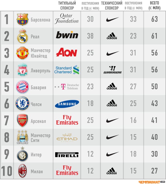 Вполне вероятно, пишет «Чемпионат», что с будущего сезона в лидеры вырвется «Манчестер Юнайтед»: у него вступит в силу контракт с Chevrolet, по которому английский клуб получит от американского автомобильного бренда 418 миллионов евро за семь лет. Пока же первая десятка клубов, извлекающих наибольшую выгоду из сотрудничества с титульными и техническими спонсорами выглядит так: