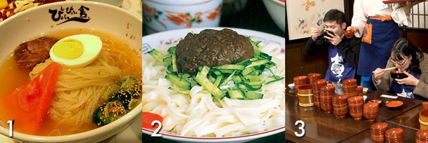 1. Morioka Reimen (холодная корейская лапша рамэн) – это блюдо напоминает традиционную кухню Северной Кореи, за тем исключением, что лапша в нем сделана из картофельного крахмала. Оно готовится на мясном бульоне и часто включает в себя фрукты, что помогает смягчить излишнюю остроту, традиционную для корейских блюд.