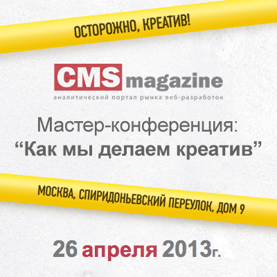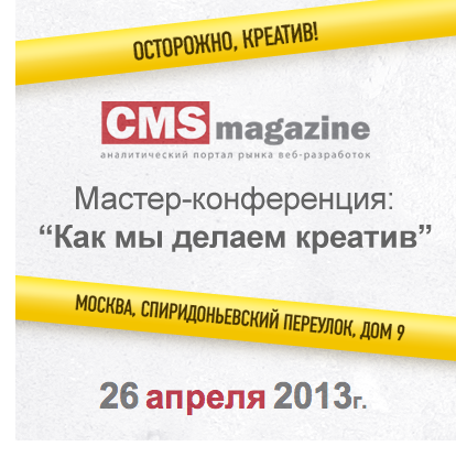 Ознакомиться с подробной программой и зарегистрироваться на конференцию можно тут: http://conf.cmsmagazine.ru/creative2013/
