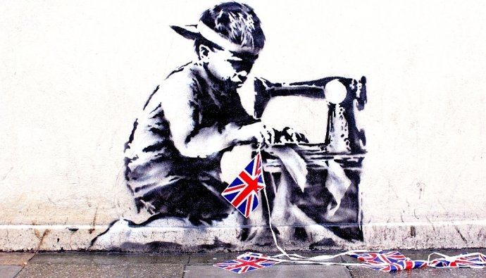 Граффити «Рабский труд» («Slave Labour») появилось на стене лондонского магазина в районе Вуд Грин в мае 2012 года. На нем изображен босоногий ребенок, шьющий на машинке британский флаг. Считается, что граффити стало реакцией художника на празднование 60-летия правления королевы Елизаветы II.