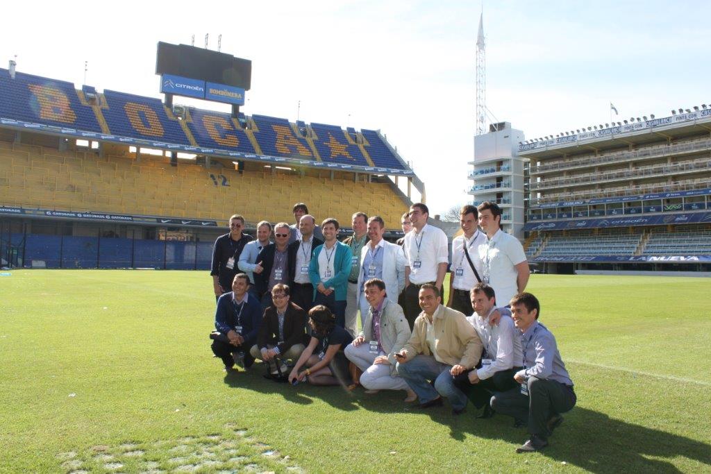 Участники латиноамериканской стажировки факультета "Менеджмент в игровых видах спорта" бизнес -школы RMA на стадионе "Бомбонера". На заднем плане - трибуна "12"