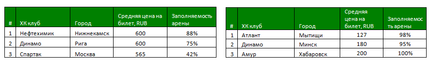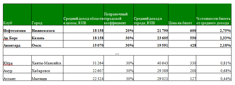 Показатель % стоимости билета от среднего уровня дохода демонстрируют насколько разный подход у клубов к ценообразованию, а значит и нацеленность на разную целевую аудиторию. Если клубы из Татарстана («Нефтехимик», «Ак Барс»), исходя из цен на билеты, считает своей целевой аудиторией болельщиков с уровнем дохода выше среднего, то «Атлант», «Амур» и «Югра» предпочитают публику с доходом на среднем уровне, пусть и с высоким уровнем посещаемости.