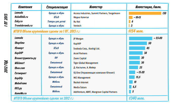 По данным компании Enter, за первое полугодие текущего года российские интернет-магазины получили инвестиции в размере 154 миллионов долларов. Общий же объём инвестиций в онлайн-торговлю с учётом прошлого года приблизился к отметке в 500 миллионов долларов.