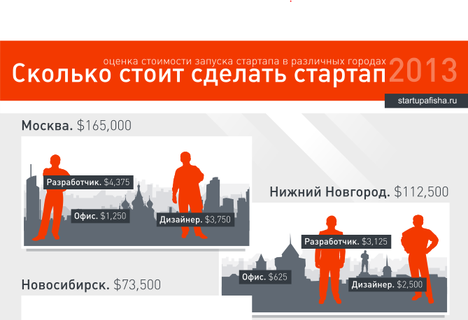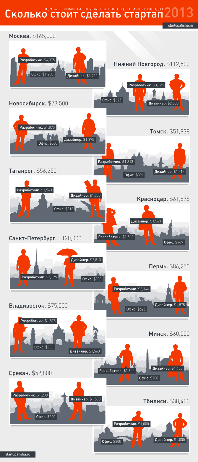 Он проанализировал, во сколько обойдётся работа команды из двух программистов и одного дизайнера в съёмном офисе в течение года. Для этого был проведён опрос среди предпринимателей из различных городов России и СНГ. В итоговый список попали Москва, Санкт-Петербург, Нижний Новгород, Новосибирск, Томск, Таганрог, Краснодар, Пермь, Владивосток, Минск (Беларусь), Тбилиси (Грузия) и Ереван (Армения).