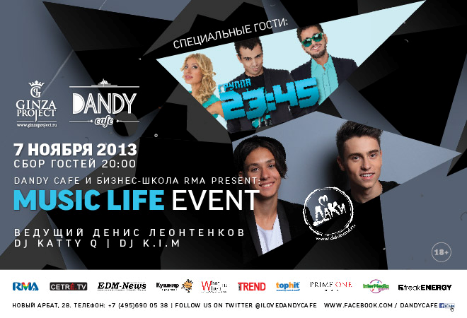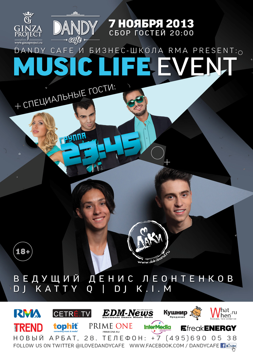 Приглашаем на вечеринку «MusicLIFE event», приуроченную к очередному выпуску факультета «Менеджмент в музыкальном бизнесе и индустрии развлечений» бизнес-школы RMA. Мероприятие состоится 7 ноября в клубе «Dandy Cafe» (Новый Арбат, дом 28). Сбор гостей и участников -- к 20.00.