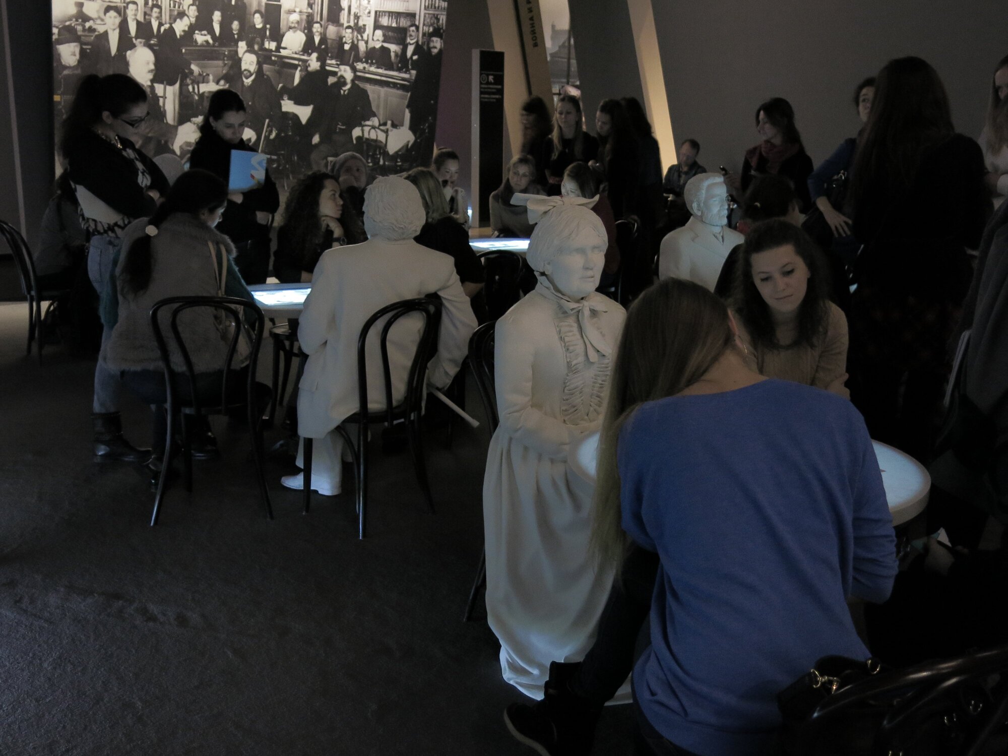 Затем, словно путешествуя сквозь время и пространство, посетители перемещаются в типичную городскую кофейню конца XIX — начала XX века, где сидя за столиком можно узнать о проблемах, которые волновали умы еврейской молодежи в то время, а также, благодаря интерактивным столам, найти дополнительную информацию и принять участие в опросе. Дальше все перемещаются в 1917 год, в самый разгар революции, а затем во времена Советского Союза.
