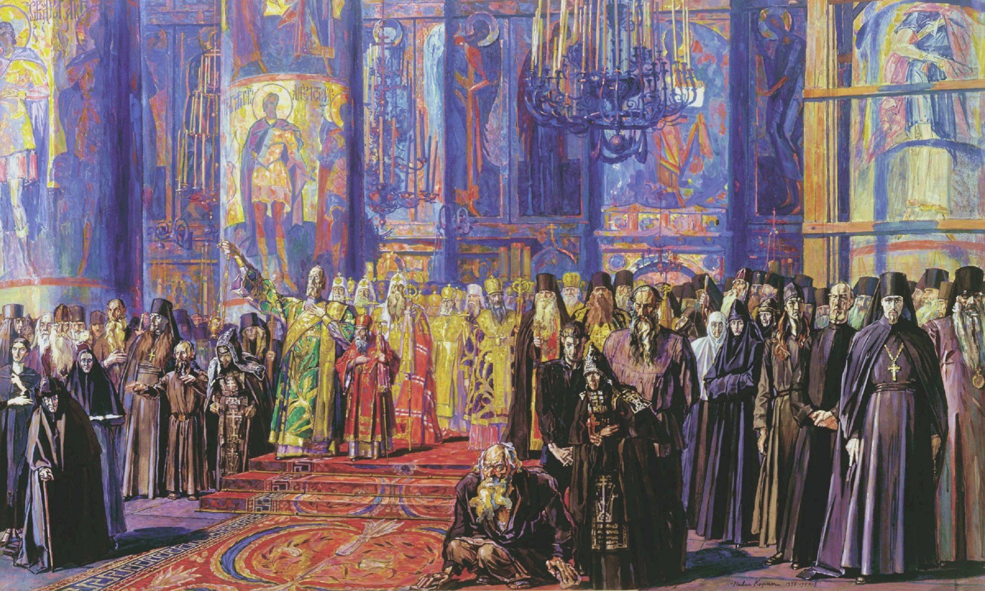 Корин, известный прежде всего полотном "Александр Невский", витражами на станции метро "Новослободская" и поздними портретами "суровом стиле", решил написать "Реквием" после прощания со скончавшимся патриархом Тихоном в 1925 году. Как признавался сам художник позже, за конкретным событием он увидел нечто большее — "церковь выходит на последний парад".