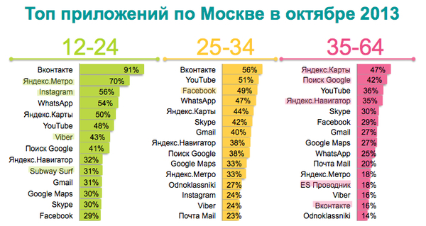 Лидеры по дневной активности выглядят практически так же: вместо поисковика от Google добавляется Instagram. Также «TNS Россия» приводит и данные о распределении приложений по возрастам.