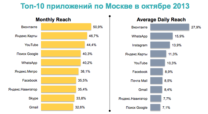 В общей сложности в октябре приложением соцсети «ВКонтакте» воспользовались 50,9 процентов москвичей, подключающихся к мобильному интернету. На втором месте оказались «Яндекс.Карты», а следом — YouTube. Поиск от Google и мессенджер WhatsApp заняли четвёртое и пятое место соответственно с отрывом в 0,1 процента.