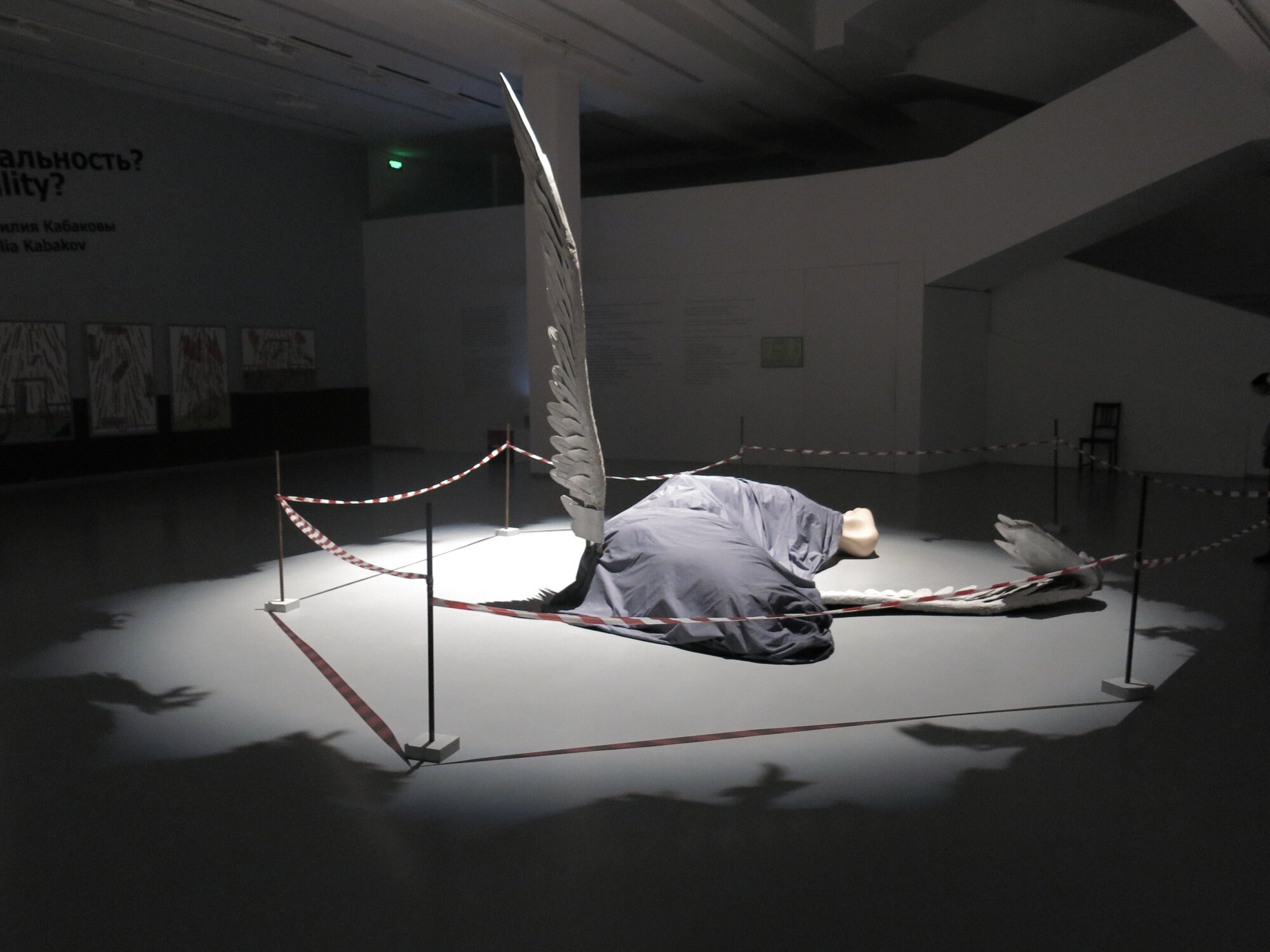 Входя в музей, первое, что видит зритель – это инсталляция с упавшим ангелом, огороженным красной лентой, как место происшествия. А под потолком на уровне седьмого этажа подвешена копия хрестоматийного агитационно-супрематического плаката Эля Лисицкого «Клином красным бей белых», из которого собственно ангел и «вывалился», прорвав известную работу. Эта инсталляция закольцовывает экспозицию, еще раз показывая отношение Ильи Кабакова в русскому авангарду и, в частности, к работам Эля Лисицкого. Интересно, что именно такой вид этой «Упавшего ангела» Илья Кабаков придумал специально для Мультимедиа Арт музея, ведь такой проект стал возможен только благодаря особой архитектуре, которая позволяет работать не только с горизонтальным пространством, но и с вертикальным.