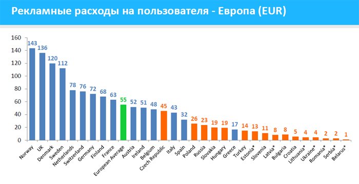 Российские рекламодатели платят 23 евро за каждого интернет-пользователя, пишет AdIndex.ru. По всей видимости, до среднего показателя по Европе (55 евро) отечественному рекламному рынку еще предстоит дорасти. Однако он пока недостижим и для остальных стран Центральной и Восточной Европы. Ближе всех к среднеевропейскому уровню подошел digital-рынок Чехии, где рекламодатели готовы выделить 45 евро на каждого юзера. Самые дорогие интернет-пользователи проживают в Норвегии (143 евро), Великобритании (136 евро), Дании (120 евро) и Швеции (112 евро).
