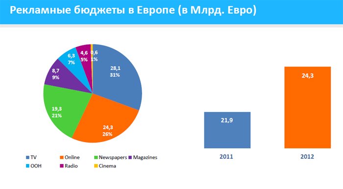 В целом, расходы на digital продолжают интенсивный рост. В 2012 году в Европе этот канал поглотил 24,3 млрд евро, что на 2,4 млрд больше по сравнению с предыдущим периодом. В России в это время доля онлайн-бюджетов также значительно выросла (с 15% до 19%), однако общеевропейского уровня в 26% пока не достигла.