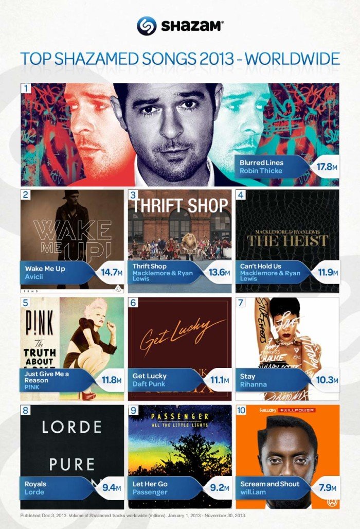 Самой зашазамленной песней года (17,8 миллионов раз) стал хит Robin Thicke — Blurred Lines.