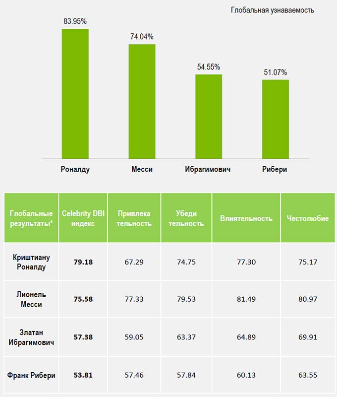 Исследования показали, что наиболее высоким индексом узнаваемости обладает Роналду, который знаком 84 процентам населения земного шара. Второе место занял Месси, а Ибрагимович и Рибери со значительным отставанием оказались на третьем и четвёртом местах соответственно, уточняет «Чемпионат».