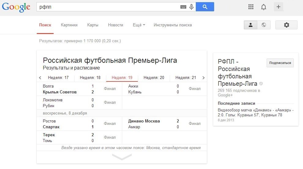 В российской версии интернет-поисковика Google появилась специальная форма с результатами футбольных матчей и расписанием игр европейских чемпионатов. Об этом представители компании сообщили в своем официальном блоге в социальной сети Google+.
