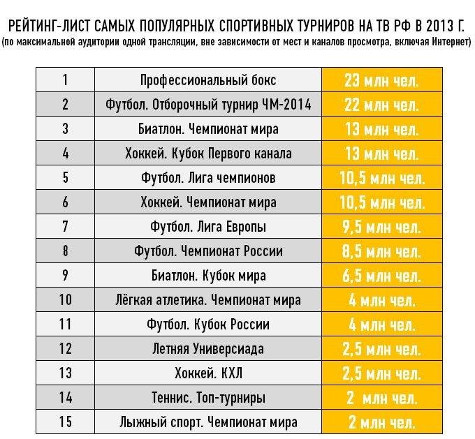 В приведённом рейтинге 12 позиций представляют международные турниры и лишь 3 – внутренние (включая КХЛ), да и их показатели заметно уступают лидерам. Такое несущественное внимание телепублики к национальным чемпионатам и кубкам не обеспечивает им надлежащей доходности от реализации медиаправ.