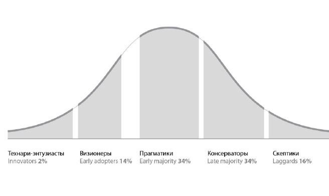 Как правило, любым продуктом начинают пользоваться именно технари-энтузиасты и нужно ориентироваться именно на них. Если стремиться сделать продукт сразу для консерваторов, то можно прогадать, так как на ранних этапах в нем будет много недочетов, которые оттолкнут консерваторов. В тоже время вы потеряете и технарей, потому что будете для них скучными. Впрочем, можно заходить с любого этапа, но это требует особого подхода и больших бюджетов на рекламу.