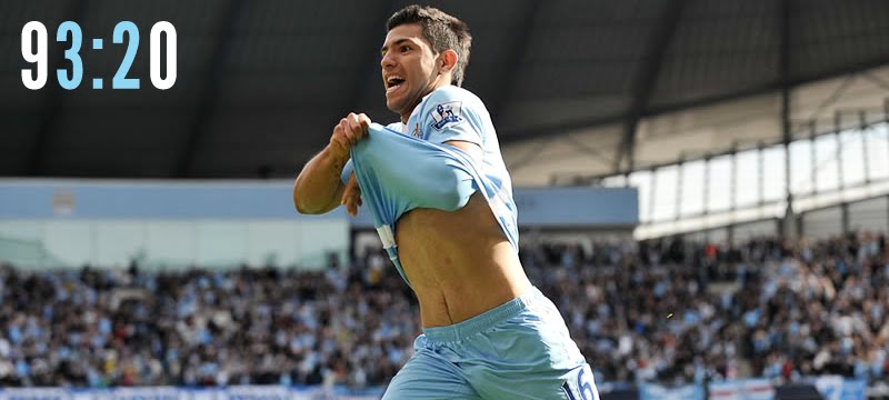 13 мая 2012 года. Серхио Агуэро празднует гол, забитый на четвертой минуте компенсированного времени матча против «Куинз Парк Рейнджерс» и принесший «Сити» победу в игре и чемпионате Англии