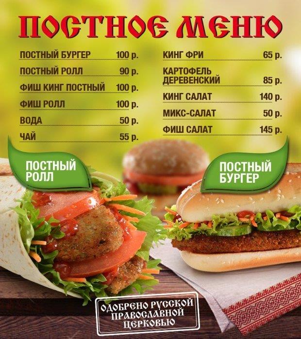 В сети ресторанов Burger King появилось постное меню, официально одобренное Русской православной церковью. Действовать оно будет в дни Великого Поста -- с 3 марта по 19 апреля. Об этом The Village сообщили представители компании.