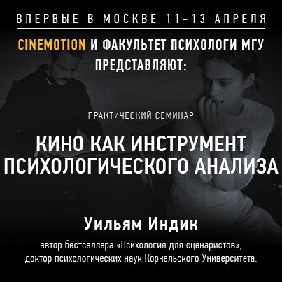 Впервые в Москве, с 11 по 13 апреля, CINEMOTION совместно с факультетом психологии МГУ проведут практический семинар «Кино как инструмент психологического анализа», который проведет Уильям Индик – доктор психологических наук Корнельского Университета, сценарный консультант, автор бестселлера «Психология для сценаристов».