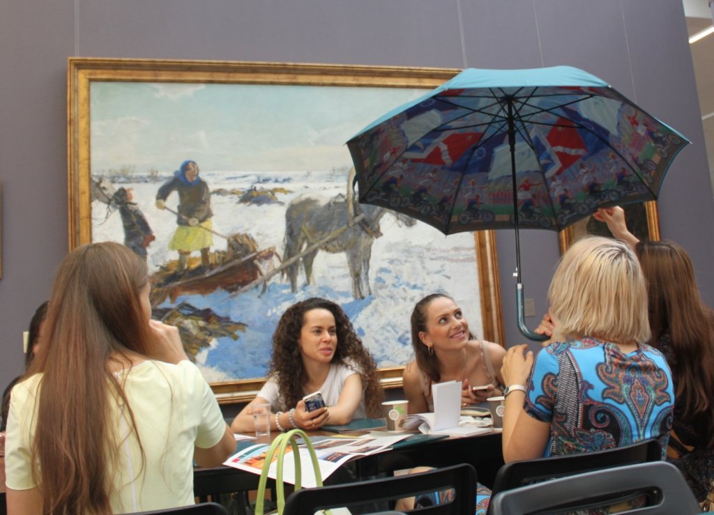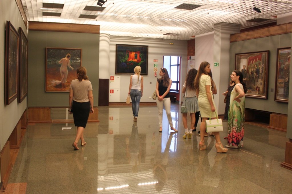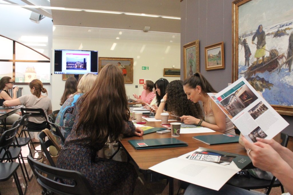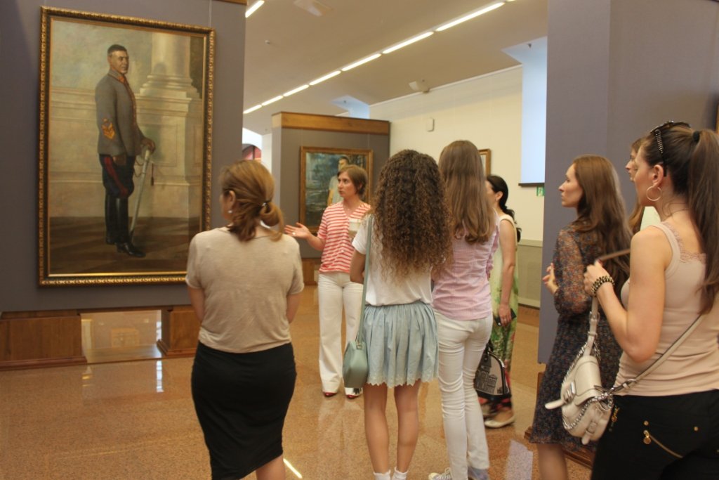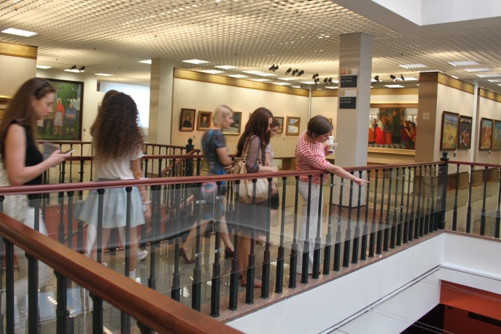 В знойный понедельник 26 мая студенты факультета «Арт-менеджмент и галерейный бизнес» отправились на занятие в Институт русского реалистического искусства, который находится в одном из старинных корпусов бывшей ситценабивной фабрики, построенной в Замоскворечье в конце XIX века. В спасительной прохладе музея студентов встретила арт-директор института Надежда Степанова, которая провела экскурсию и рассказала об истории музея, о постоянной и временных экспозициях и поделилась секретами создания выставок.