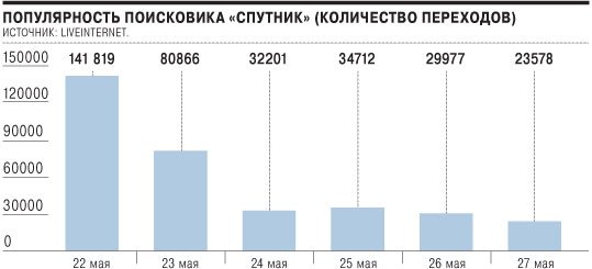 По данным LiveInternet, во вторник, 27 мая, количество переходов россиян на интернет-сайты со страниц поиска "Спутника" составило примерно 23,6 тыс. Количество переходов — основной показатель, на который ориентируются российские интернет-компании при оценке долей аудитории поисковых сервисов. 22 мая, в день запуска "Спутника", этот показатель у национального поисковика достигал 141,8 тыс., но с тех пор постепенно снижался (см. график). За вчерашний день к 20:00 со "Спутника" было совершено лишь 16,5 тыс. переходов. Доля ресурса в поисковых запросах россиян, таким образом, составляла вчера лишь 0,01%. Для сравнения: доля "Яндекса" достигала 62,2%, Google — 27,7%, поиска Mail.ru — 7,3%.