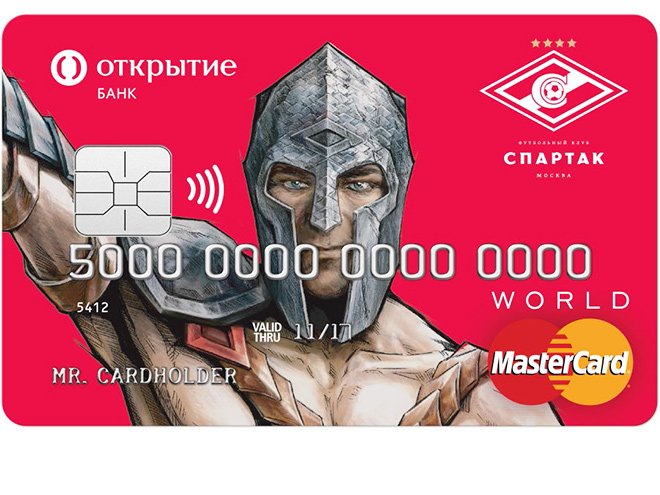Банковскую карту болельщика «Спартака», разработанную на базе премиальной карты Mastercard World с применением технологии MasterCard Pay pass, можно открыть во всех отделениях банка «Открытие».