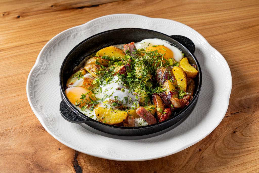 Завтраки в ресторане подают круглосуточно. В меню: каши, блюда из яиц, драники, сэндвичи, сырники, панкейки. Среди интересных позиций: шакшука с хрустящей чиабаттой (570) и домашние панкейки (560).