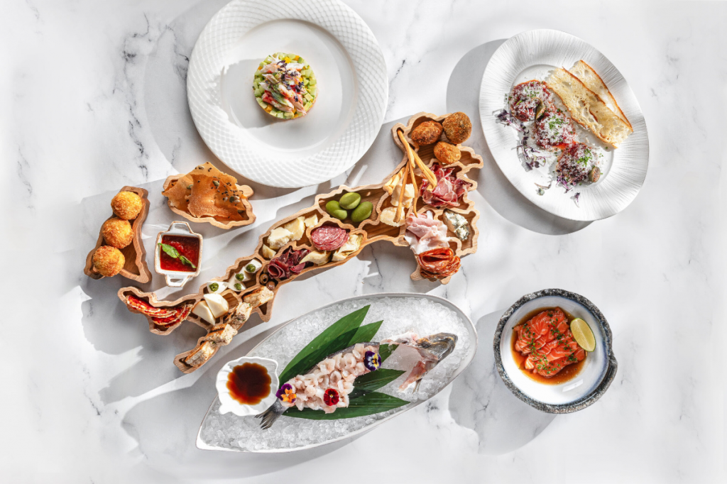 Карпаччо из мраморной говядины с руколой и пармезаном 1 190 рублей, Ассорти итальянских колбас 2 700 рублей, Каталана 1 490 рублей, Томатный суп со страчателлой и базиликом 950 рублей, Папарделле с телячьими щечками и бобами эдамаме 1 350 рублей,