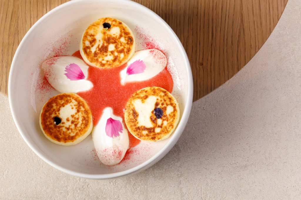 Сырники со сметаной и клубничным пюре 750 рублей, Греческий йогурт с гранолой 600 рублей,