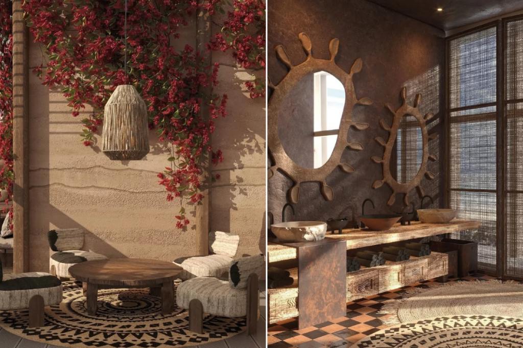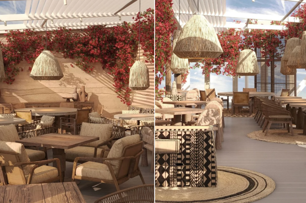 Интерьер ресторана разработало архитектурное бюро Artworks. Акцент сделали на природные оттенки и натуральные материалы, например, состаренное дерево, глиняные текстуры, льняные ткани, плетеные элементы мебели и светильников. Пространство украшают многочисленные растения.