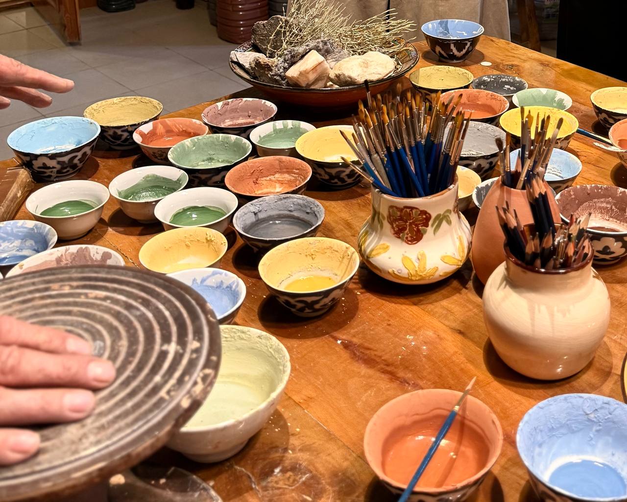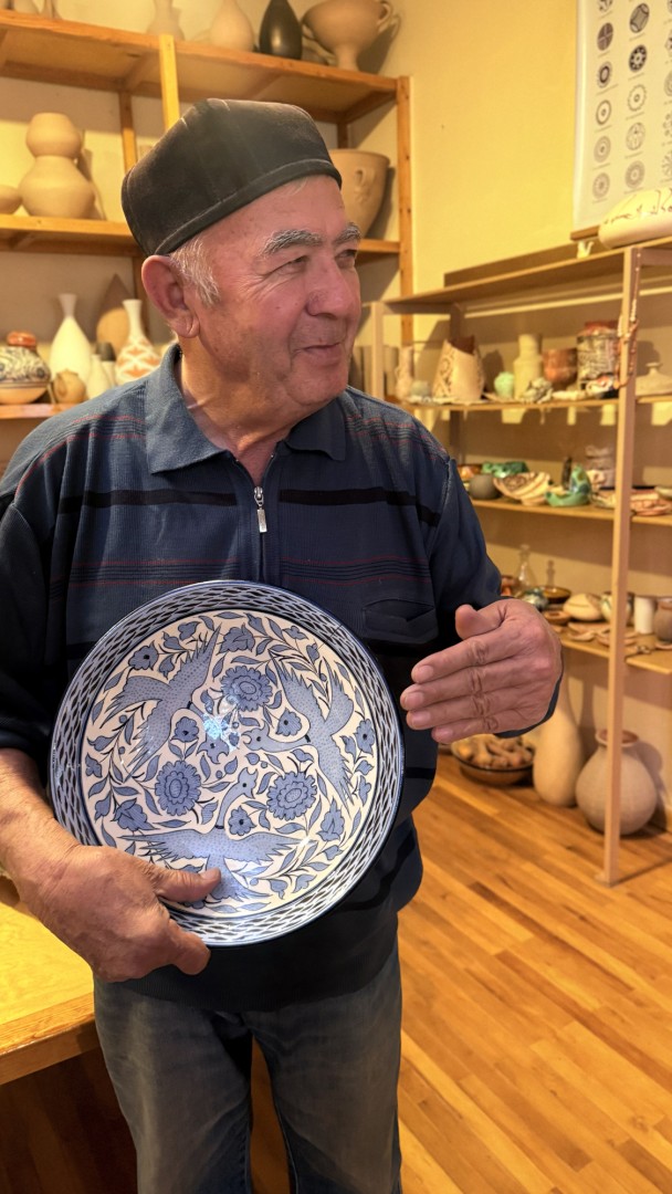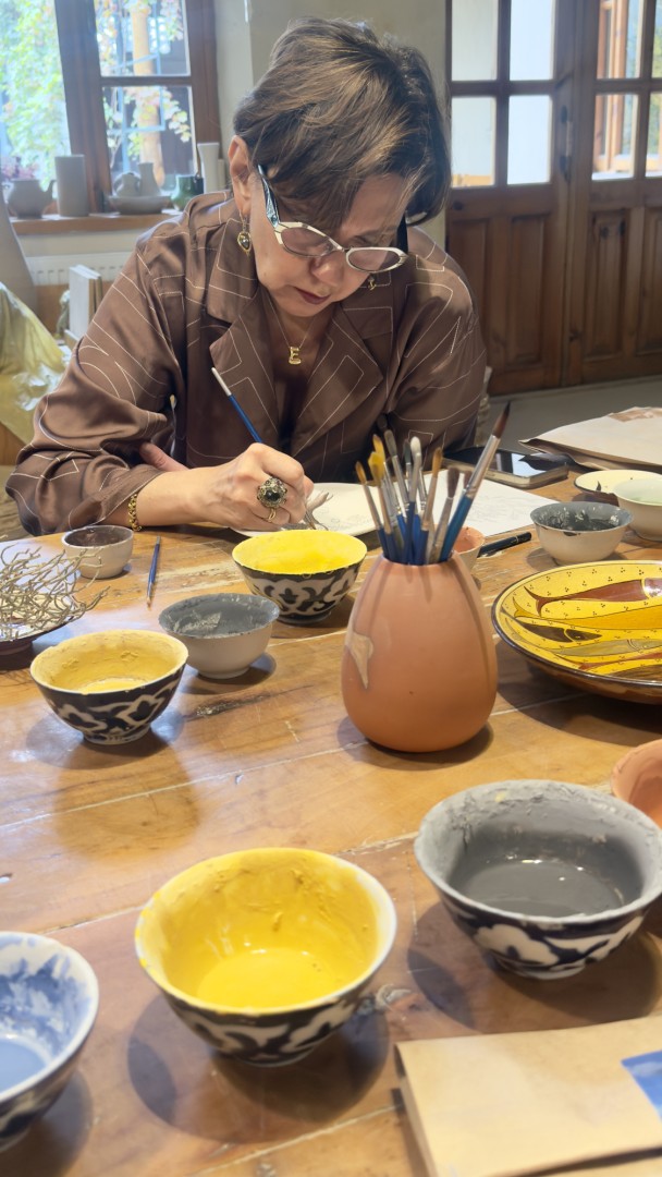 Мы расписывали тарелки в традиционном узбекском стиле: гранаты, ветви, орнаментальные волны и постепенно поняли, что рисунок становится разговором с материалом. Мы сидели вокруг стола под чутким взглядом мастера и его дочери и начали наносить узоры: гирлянды из гранатов, перья птицы, сетка арабесок. Мастер попросил задуматься, откуда берётся орнамент, почему гранат — символ востока, почему линия изгиба напоминает путь каравана. После мы пили чай в саду, звучала музыка, сродни молитве или медитации, общались с детьми мастера, которые продолжают его дело: сын, работающий в современном направлении, экспериментируя с глазурями и формой; дочь — дизайнер, соединяющая традиционные орнаменты и моду. В этом доме-мастерской ремесло оказалось живым слепком памяти, которое дышит вместе с современностью.