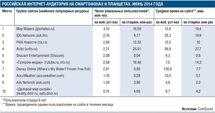 Самым популярным мобильным сервисом является Gismeteo.ru. Почти 4,1 миллиона пользователей заходили на него в июне с мобильных устройств, из них три миллиона — со смартфонов, 1,3 миллиона — с планшетов. Аудтория десктопной версии Gismeteo.ru составляет 16,6 миллиона уникальных пользователей.