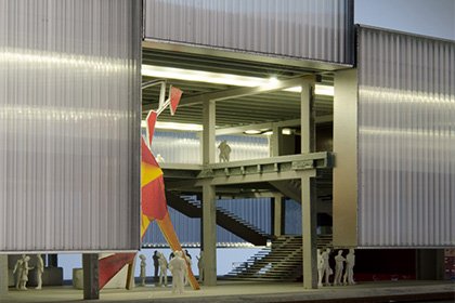 Двор «Гаража» будет использован как выставочное пространство для паблик-арта. Фасад, приподнятый на два метра над землей, позволит визуально объединить интерьер павильона с Парком Горького. Конструкция фасада — панели шириной 11 метров будут раздвигаться вертикально, поднимаясь на семь метров над крышей здания.