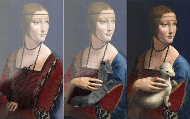 Котт, три года исследовавший картину, пришел к заключению, что дописанный на холсте зверек сначала выглядел совсем иначе. Сперва он был довольно щуплым и серого цвета, но в окончательном варианте да Винчи животное стало крупным и мускулистым, а цвет его шерсти стал белым, сообщает The Guardian.